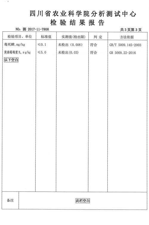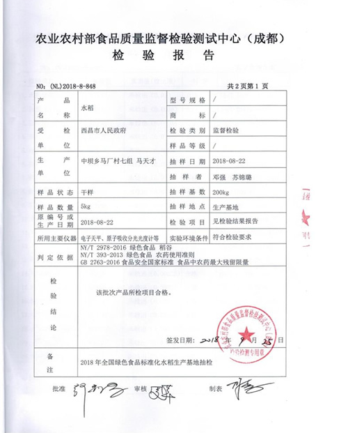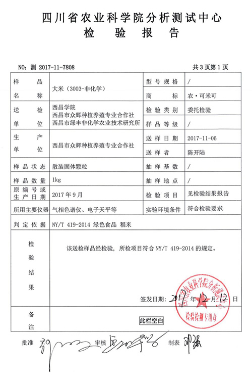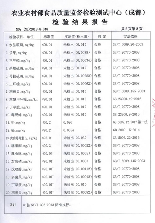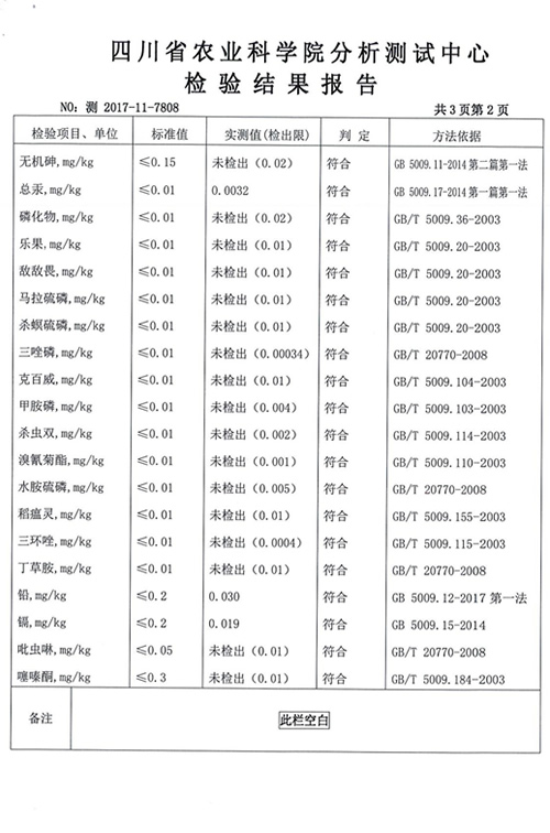 说明:外地通例用肥的“农残”严重超标,,,,,而一连三年使用多功效有机肥莳植的水稻,,,,,经西昌市政府送权威检测部分检测,,,,,农残均未检出,,,,,重金属含量低于国标并呈逐年降低趋势,,,,,以镉为例,,,,,2016年镉含量0.037mg/Kg,,,,,2017年0.019mg/Kg,,,,,2018年0.0054mg/Kg。。。批注多功效生物有机肥产品有一连降解重金属作用。。。