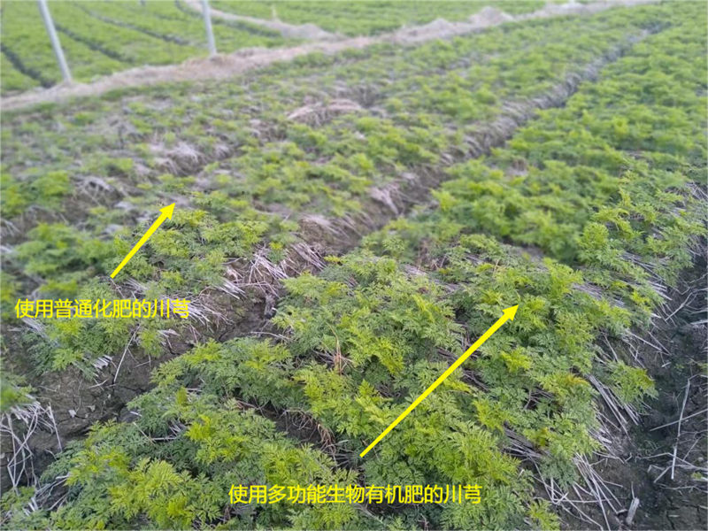 在彭州的川芎试验基地,,,,,使用多功效生物有机肥与同期使用通俗化肥莳植的川芎相比差别十明确显。。。。。。